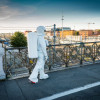 Zeno's second paradox, freely inspired by the mathematical paradox of Achilles and the turtle, is a slow motion walking of an astronaut, the slow-motion walker par excellence, from one point in the urban landscape to another. In spite of the continuous provocation to sudden actions to react to the surroundings, the astronaut resists in her gestures of slowness, expanding the duration of every action in an increasingly paroxysmal contrast with the reality around her. Always accurately in slow motion, she engages in everyday actions - drinking coffee at a café, getting on a bus, crossing a street - and interacts with those she meets. The result is a hypnotic and surreal apparition within the urban context, a real moviola that captures the attention of passers-by, an occasional audience, and becomes an invitation to abandon their everyday life for a moment and ask themselves about this extraneous apparition.