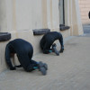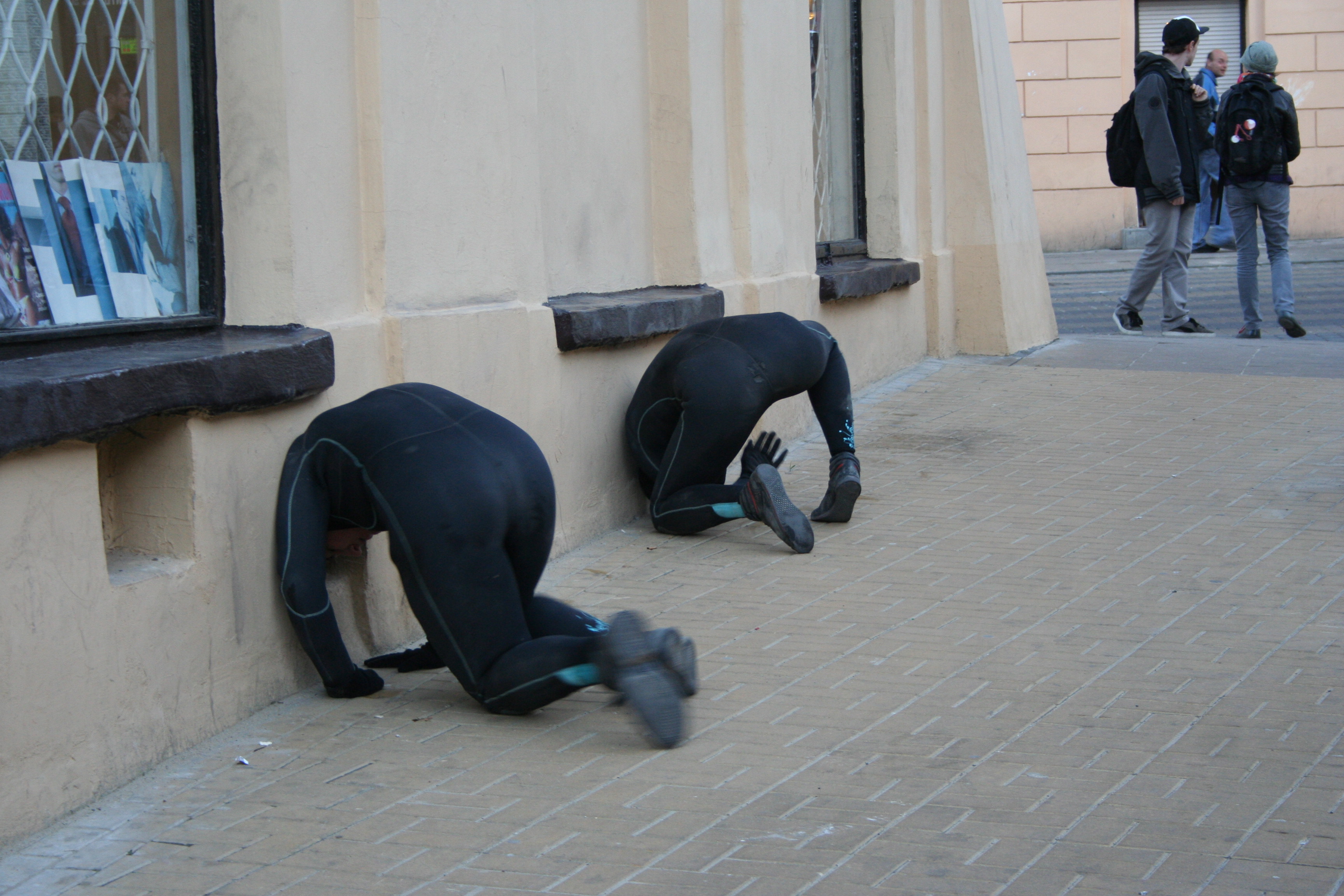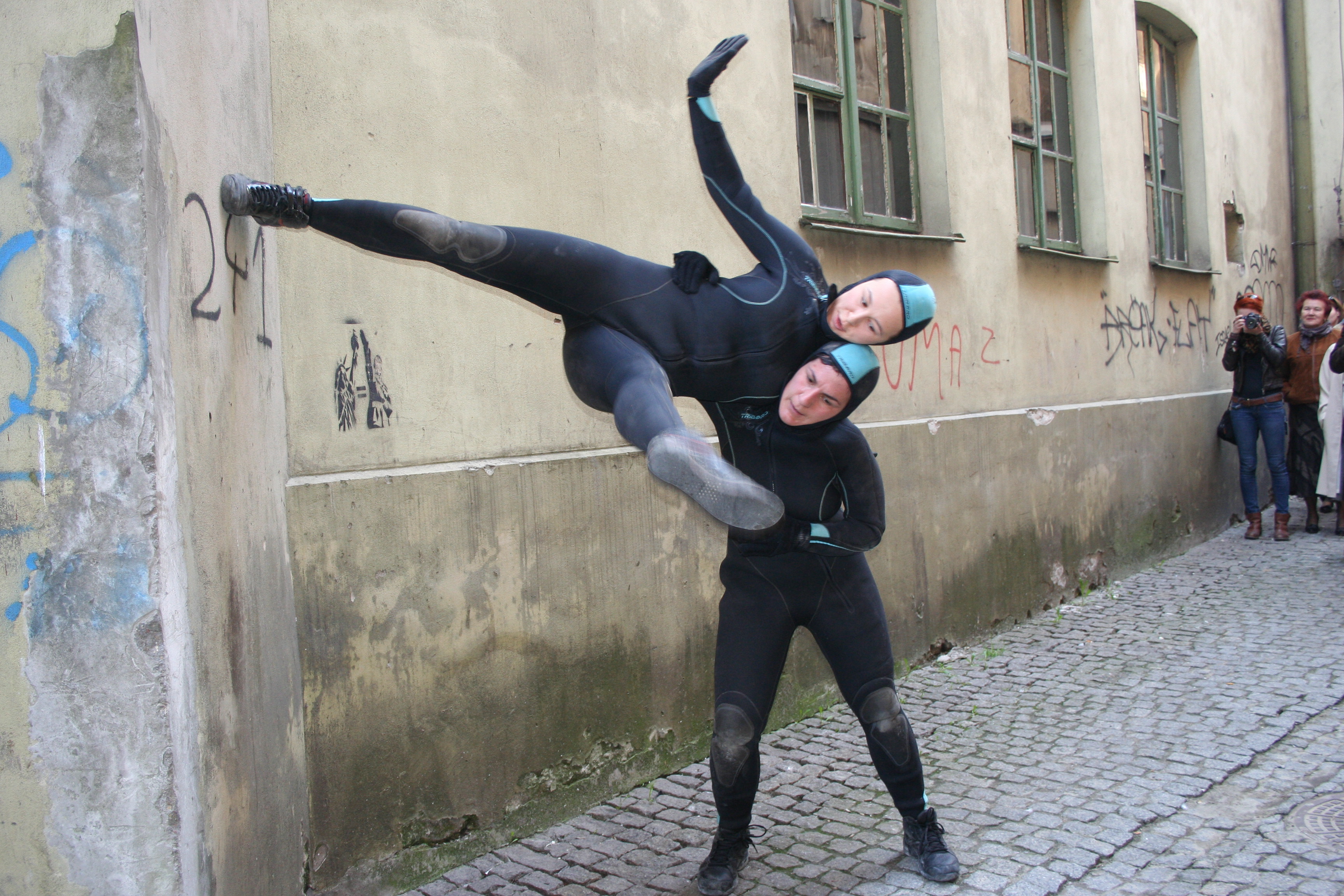 A performative body-metric survey of the city center of Lublin. The experiencing of the surrounding leads the moving body towards the built environment, searching for input to fill the gap existing between body and architecture. The gap is between a turning, twisting, not fitting any system, soft and changeable organic human form of pretending-to-be-rational human beings and the rational, hard, precise, not alive and pretending-to-be-eternal architectonic constructions. Human beings can dance because they can experience their selves and the surrounding and there, in the experience, they meet the space. A spaced that is more and more shaped by architecture. So what if we allow architecture to shape a dance? What if a dance start from the awareness of the built architecture of the place where the body is moving? What if we try to become architecture?