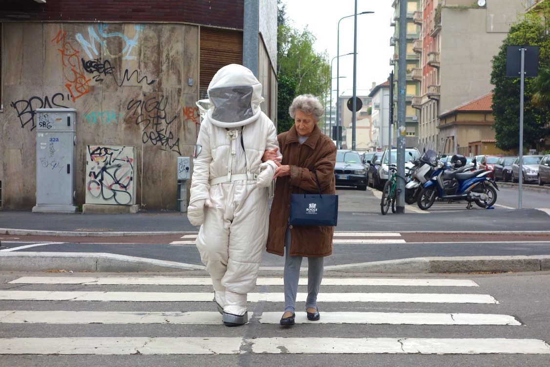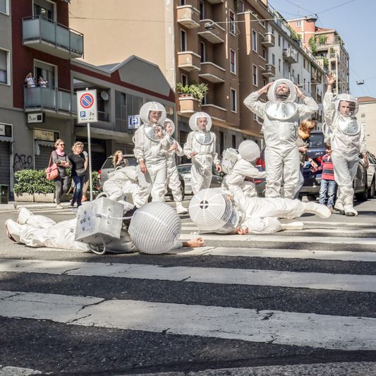 "On the afternoon of 15 May 2016, while a group of astronauts were crossing the city, a part of the neighbourhood was living and acting out its daily activities at an altered pace. The slow gesture of an ice-cream seller serving a cone to a customer, a pedestrian crossing in a time that seems endless, waiting for a bus are some of the actions that suspended the city of Milan. Through the practice of slowness, different people have been brought together in an experience that disrupts the rhythms of actions and breath itself. Is a city in slow motion a non-city? How many experiences and narratives are hidden in the practice of an oxymoron?" - Fare Città. Arte pubblica e laboratorio by Costanza Mieli