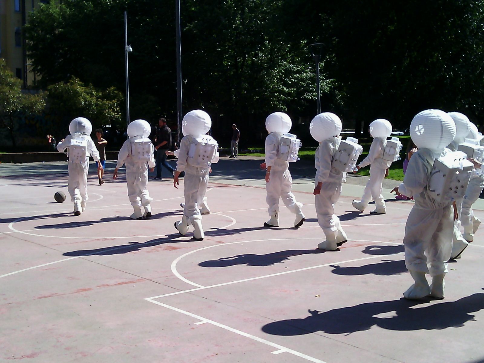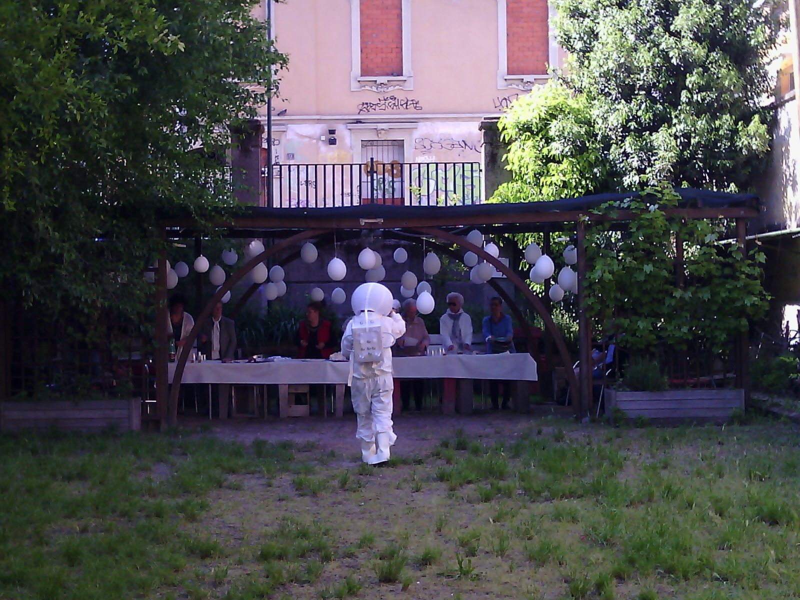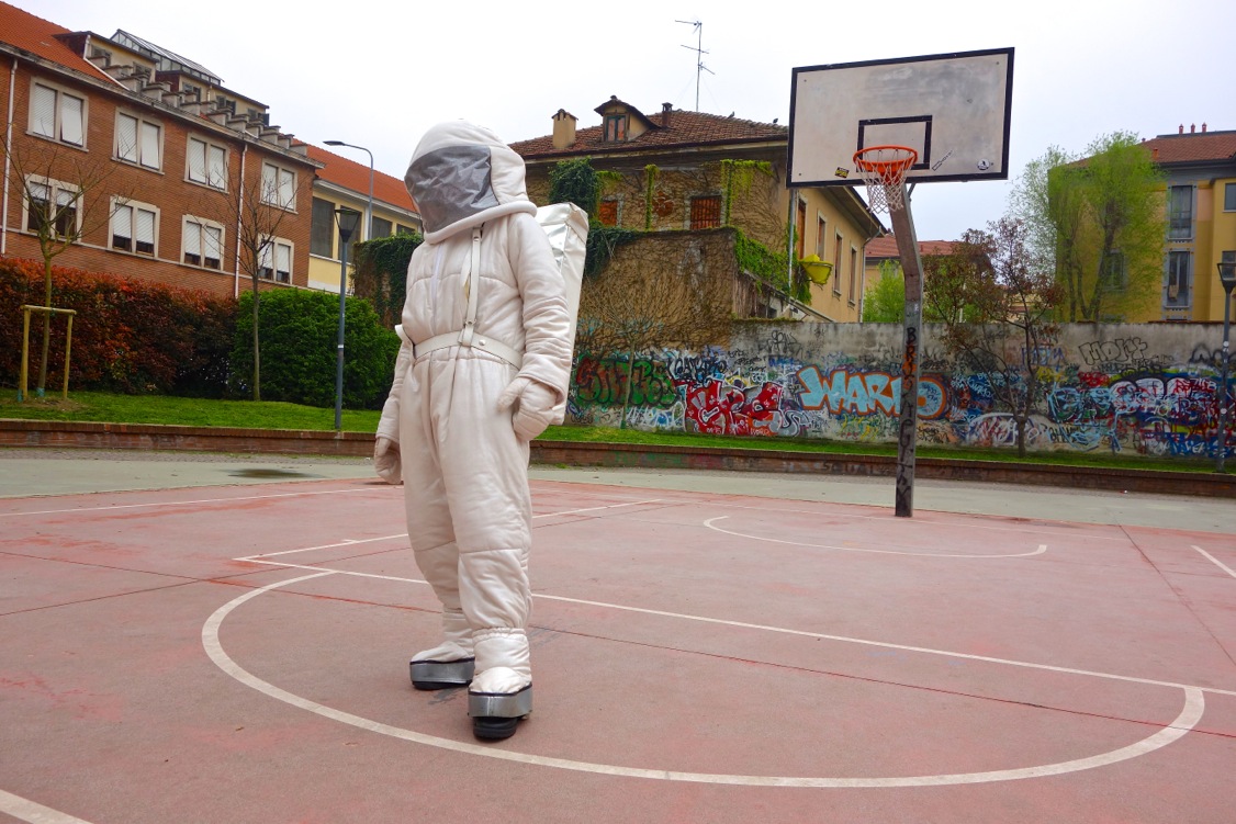 “Nel pomeriggio del 15 maggio 2016, mentre un gruppo di astronauti attraversava la città, una parte del quartiere viveva e agiva le proprie attività quotidiane ad un ritmo alterato. Il gesto lento di una gelataia che serve il cono ad un cliente, l’attraversamento sulle strisce pedonali in un tempo che sembra infinito, l’attesa di un autobus sono alcune delle azioni che hanno sospeso la città di Milano. Tramite la pratica della lentezza, persone diverse sono state accomunate in un’esperienza che sconvolge i ritmi delle azioni e lo stesso respiro. Una città al rallentatore è forse una non città? Quante esperienze e narrazioni si nascondono nella pratica di un ossimoro?” - da Fare Città. Arte pubblica e laboratorio di Costanza Mieli